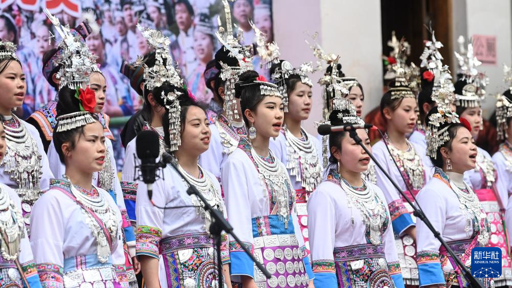 3月1日,侗族群众在广西三江侗族自治县梅林乡文化广场表演侗族大歌。