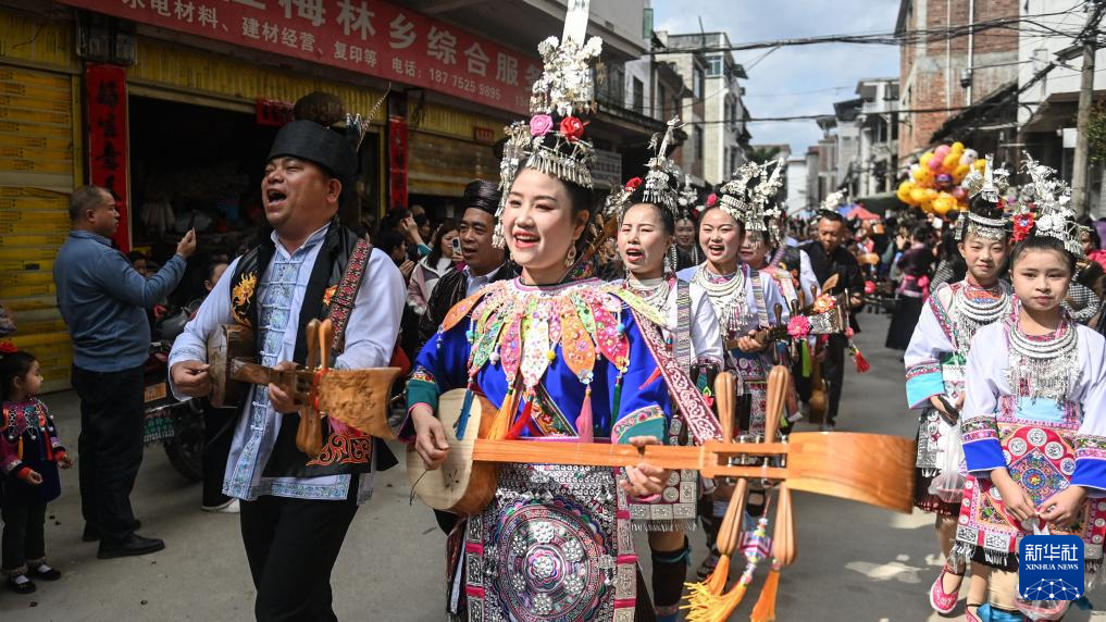 3月1日,在广西三江侗族自治县梅林乡,参加“二月二”庆祝活动的侗族群众在沿街巡演。