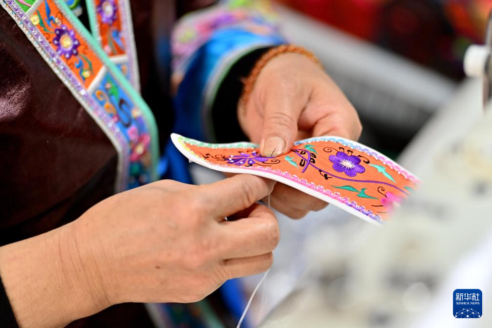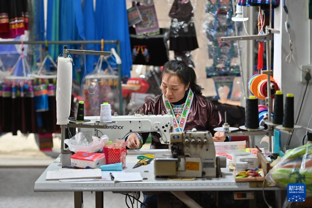 在广西柳州市融水苗族自治县杆洞乡杆洞村,杨洪英在苗衣制作基地工作(3月4日摄)。