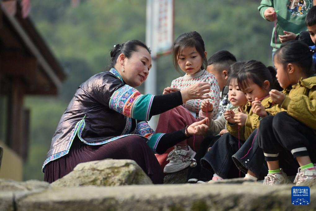 在广西柳州市融水苗族自治县杆洞乡党鸠村,杨洪英(左一)在指导小学生学习刺绣知识(3月3日摄)。