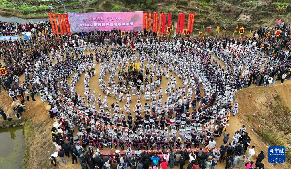 在广西柳州市融水苗族自治县杆洞乡百鸟衣芦笙坡会,各族群众一起跳芦笙踩堂舞。其中有不少人的苗族服饰是杨洪英制作的(无人机照片,2月5日摄)。