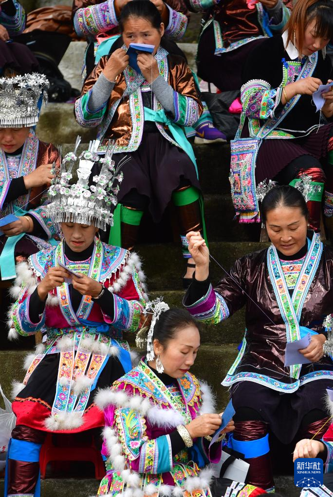 在广西柳州市融水苗族自治县杆洞乡党鸠村,杨洪英(左)向网友展示苗族刺绣技艺(3月3日摄)。