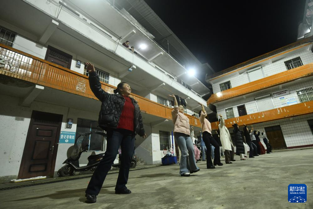 在广西柳州市融水苗族自治县杆洞乡杆洞村,杨洪英(左一)在练习苗族舞蹈(3月3日摄)。