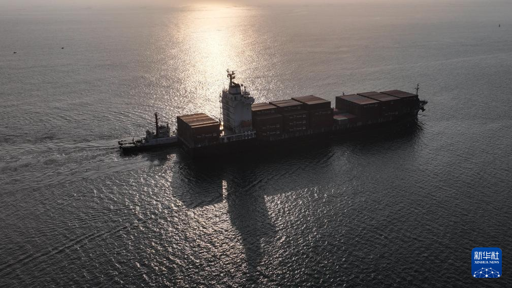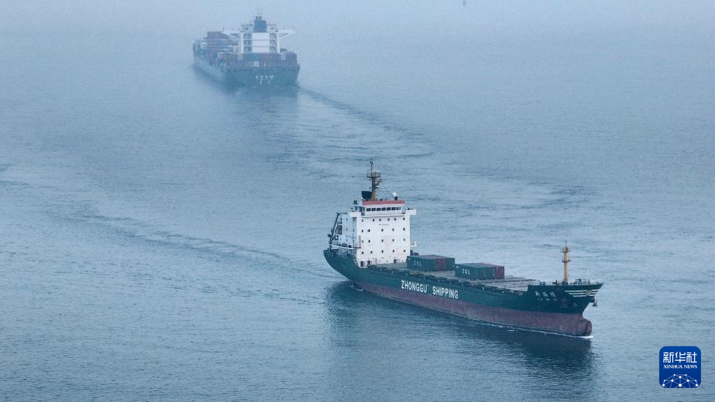 3月4日,一艘海事船在助推海轮进入钦州港泊位(无人机照片)。