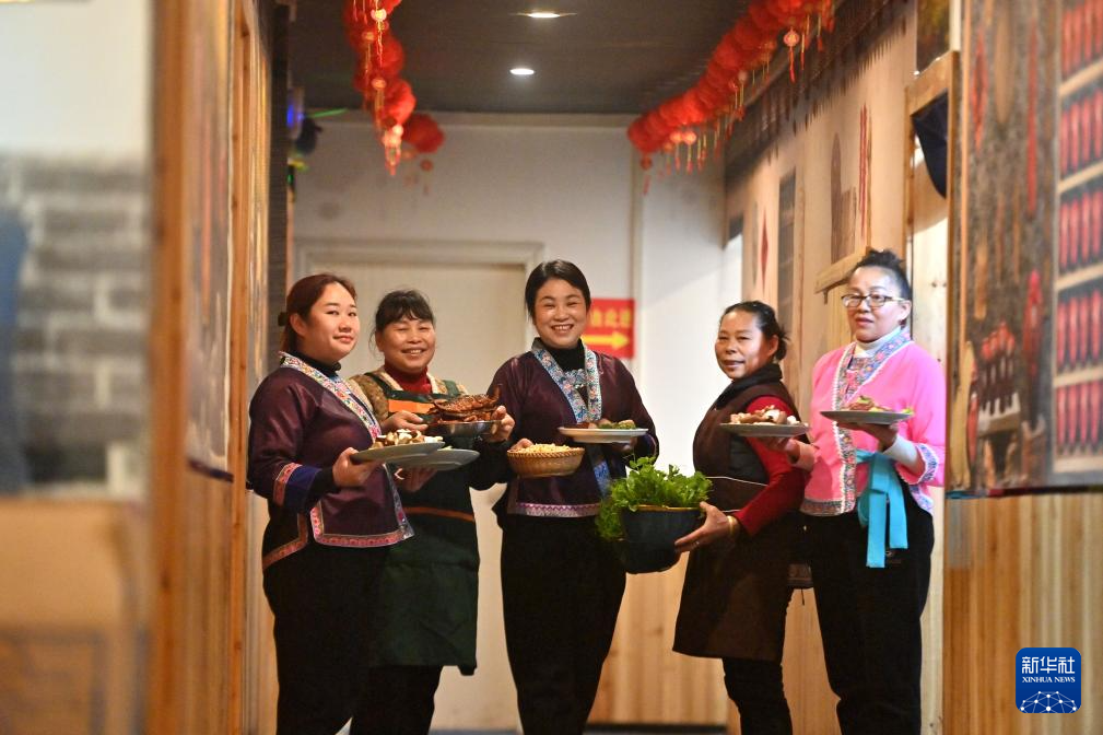 在广西柳州市融水苗族自治县融水镇一家餐馆,负责人吴葵花(右三)和员工们在展示菜品(2025年2月28日摄)。吴葵花经营餐馆22年,长期为当地农村群众提供稳定就业岗位,并收购偏远山区群众种植的蔬菜。