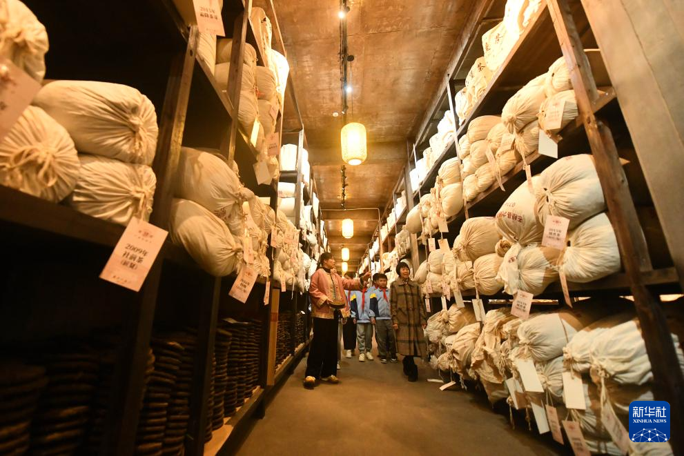 在广西梧州市苍梧县六堡镇黑石山茶厂,六堡茶制作技艺国家级代表性传承人韦洁群(右一)和女儿石濡菲(左一)向小学生介绍茶文化(2025年2月21日摄)。多年来,母女俩依托六堡茶原产地和六堡茶历史文化等优势,创新产业融合发展模式,带动一方群众增收致富。