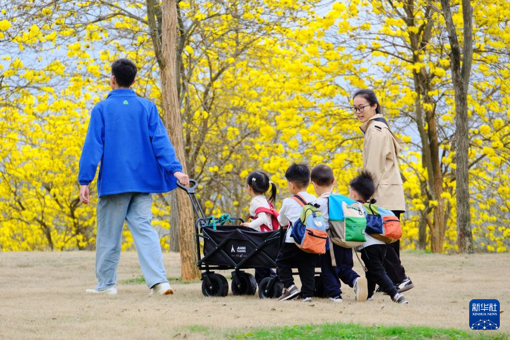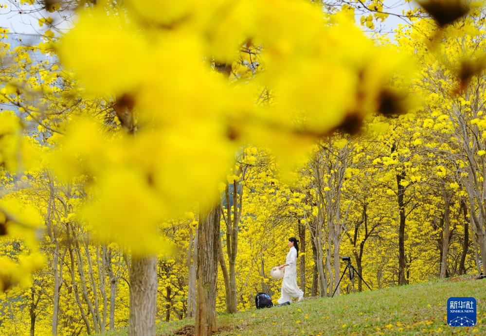 时下正是广西南宁市青秀山风景区内的黄花风铃木盛放时节,吸引了众多游客前往观赏。