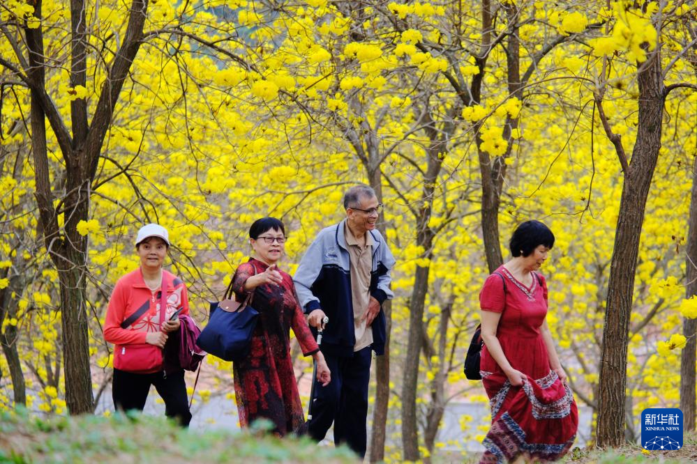 3月14日,游客在广西南宁市青秀山风景区观赏黄花风铃木。