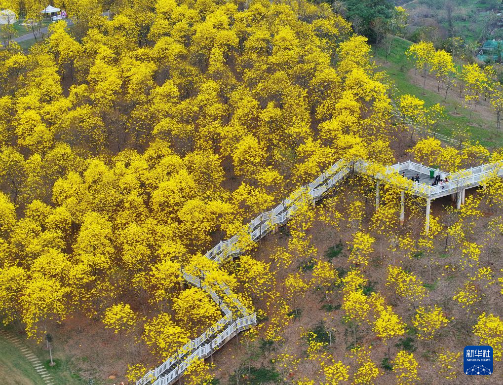 3月14日,游客在广西南宁市青秀山风景区观赏黄花风铃木(无人机照片)。