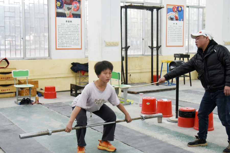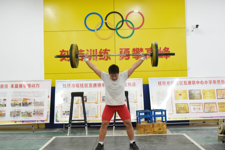 天刚蒙蒙亮,桂林市临桂区五通镇中心小学举重馆里已热闹非凡。“腰腿收紧,要用力”“蹬腿往上发力提走”“注意动作要领,把身体放开”……教练的声音此起彼伏,为日常的训练增添了几分紧张气氛。