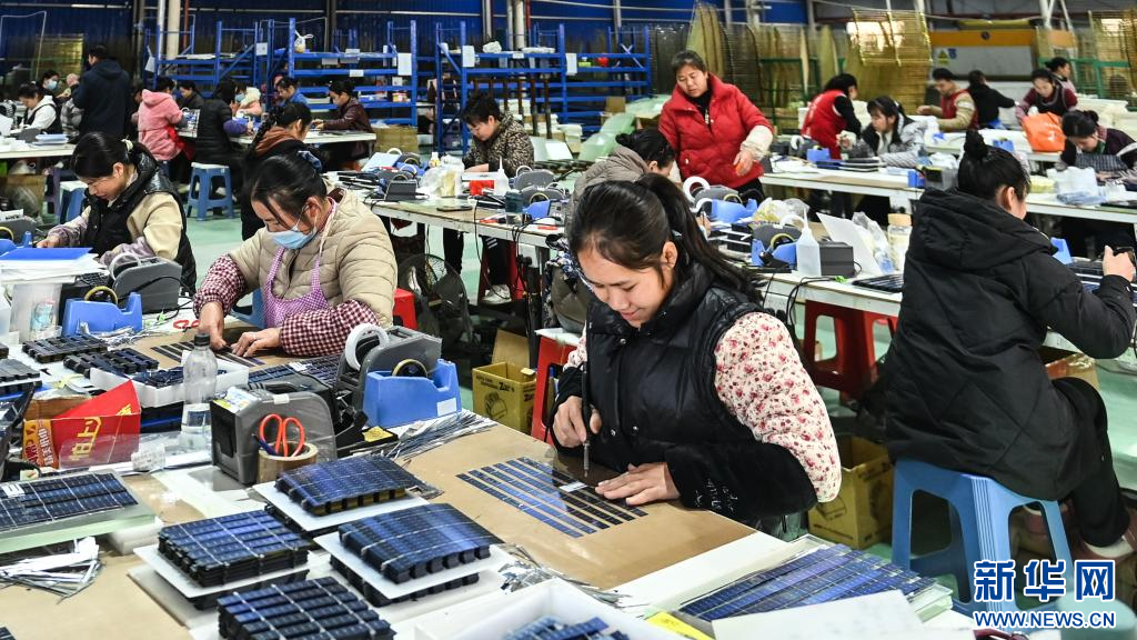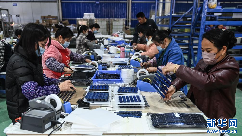 3月19日,在广西贵光新能源科技有限公司的生产车间,工人在组装太阳能光伏板上的电子元件。