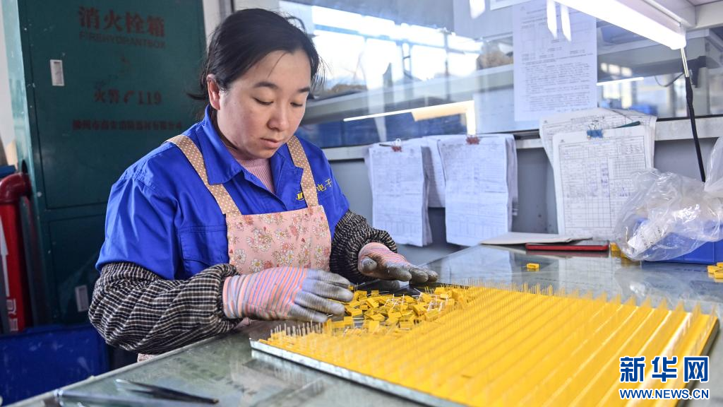 3月19日,在广西金佳电子有限公司的生产车间,一名工人在组装电容器。