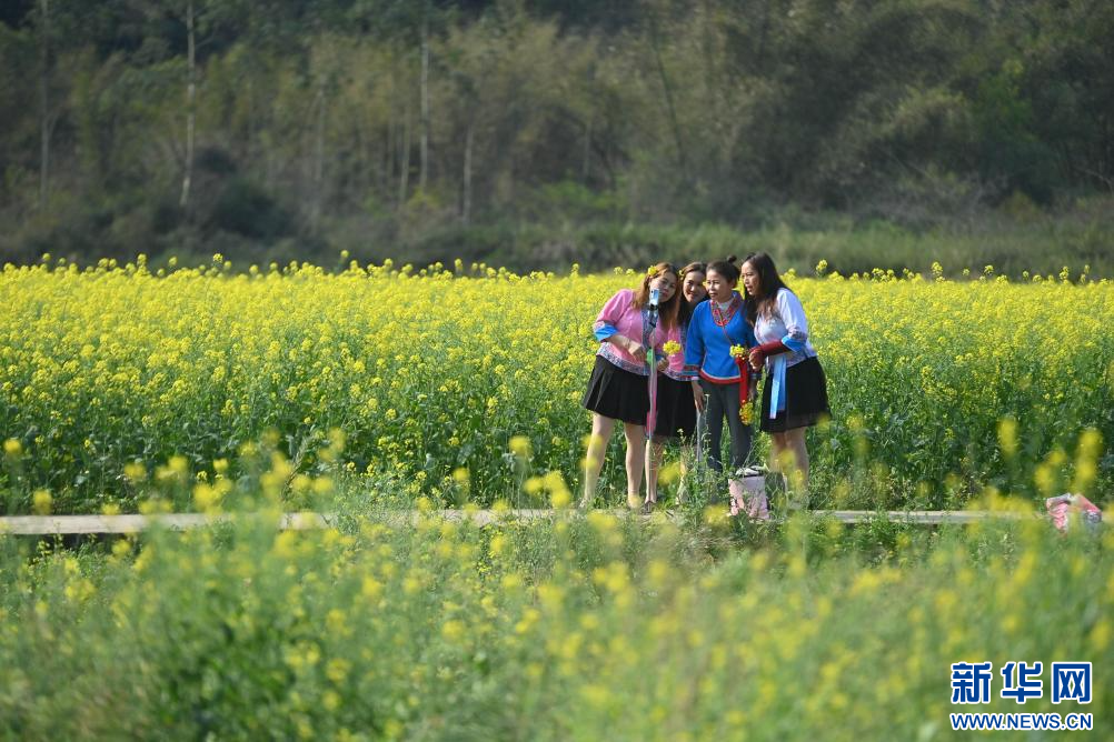 游客在广西融水苗族自治县融水镇新国村的油菜花地踏青游玩(3月21日摄)。