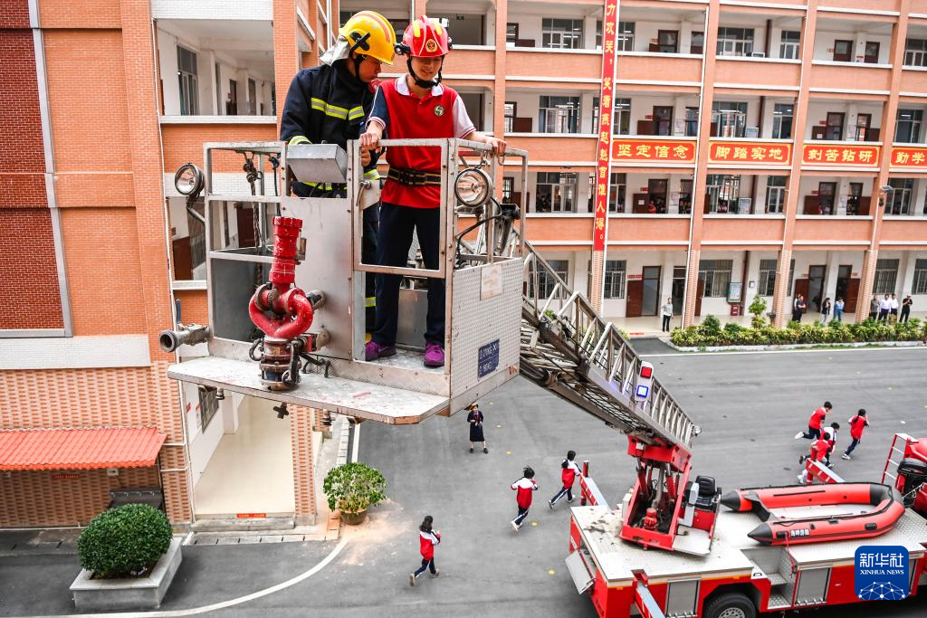 3月28日,在广西兴业县第一中学,消防员带领学生开展云梯逃生演练。