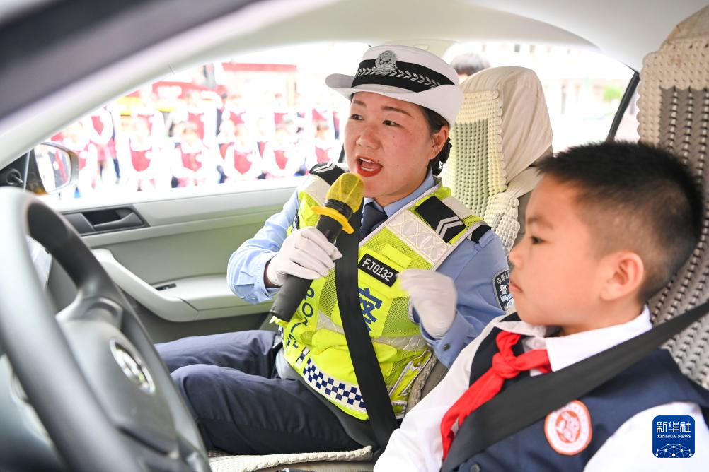 3月28日,在广西兴业县石南镇至德小学,交警带领学生在车内感受视野盲区。