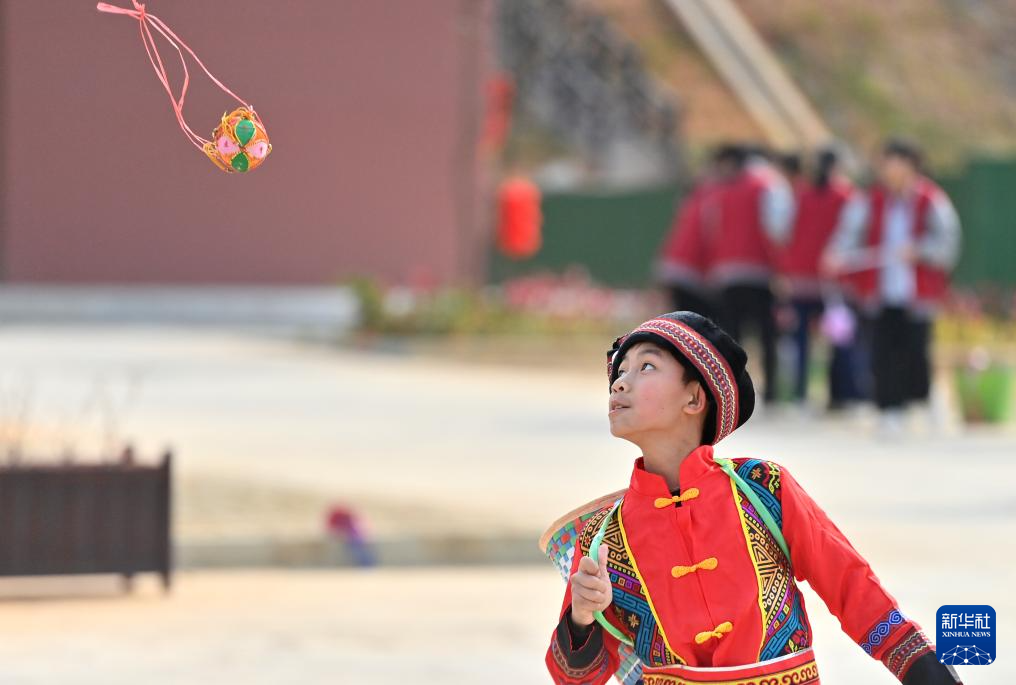 2月20日,广西梧州市长洲区倒水镇富万村富万小学的学生参加抛绣球比赛。
