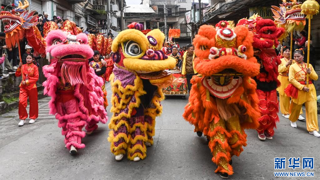 3月31日,龙狮队在广西三江侗族自治县古宜镇沿街巡演。