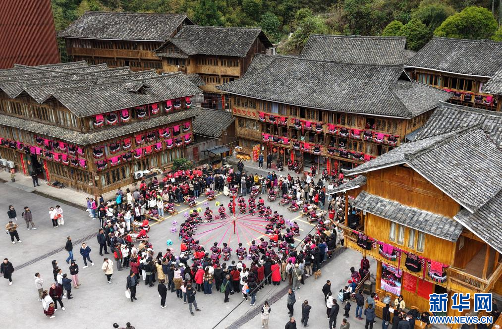 3月31日,当地群众在广西三江侗族自治县古宜镇表演民族歌舞(无人机照片)。