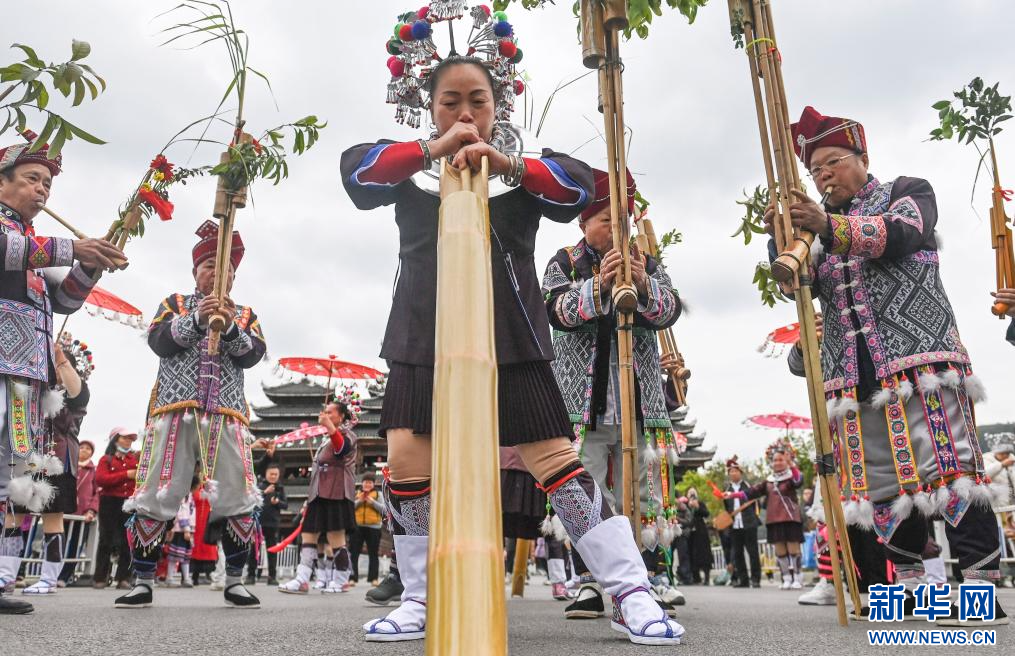3月31日,在广西三江侗族自治县古宜镇举行的“三月三”庆祝活动上,侗族群众吹奏芦笙。