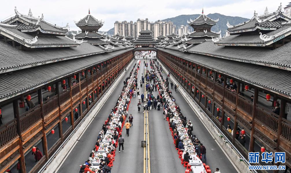 3月31日,在广西三江侗族自治县古宜镇,人们参加百家宴。