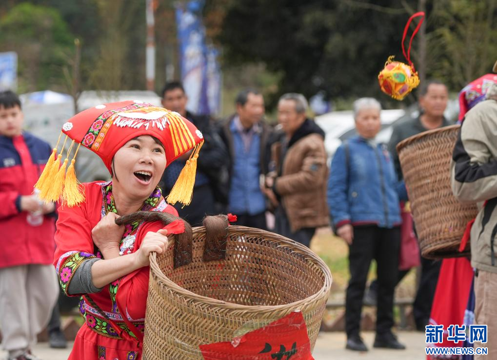 3月31日,在广西融水苗族自治县三防镇乃文村,村民参加抛绣球比赛。