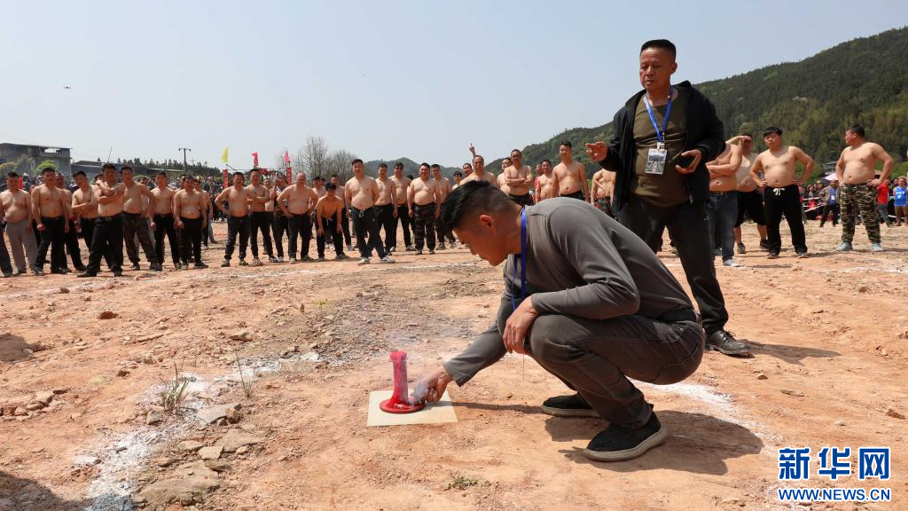 4月1日,在三江侗族自治县斗江镇沙宜村,一名炮师在鸣炮开赛。