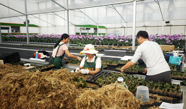 春日,在上林县粤桂协作花卉产业园的智能温室里,蝴蝶兰与红掌在控温环境中舒展身姿。花农石芳握着喷壶穿行在花架间:“以前在广东打工,现在家门口种花,每月收入比城里还稳当。”