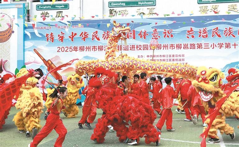 连日来,柳江区各中小学陆续举办以“三月三”为主题的节庆活动。在柳江中学,高杆狮表演《醒狮铸华魂》、舞蹈《狮舞青春》、石琴演奏《采茶姐妹上茶山》等节目轮番上演,板鞋竞速、竞技龙比拼、背篓接绣球等运动项目精彩比拼;在柳邕路第三小学,同学们用精彩的舞龙表演,喜迎“三月三”;在柳江区壮语文学校附属小学,《又见刘三姐》《石榴花开三月三》《壮歌不唱不快活》等山歌对唱,让孩子们在歌声中感受民族节庆氛围,展现壮乡儿女的热情与活力;在柳江区机关幼儿园,悠扬的小提琴声、欢快的竹竿舞展现非遗魅力,小朋友们共同制作五色糯米饭、抛绣球、舞龙狮,体验丰富多彩的民俗风情。