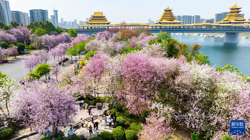 4月16日,游客在广西柳州市环江滨水大道赏花游玩(无人机照片)。
