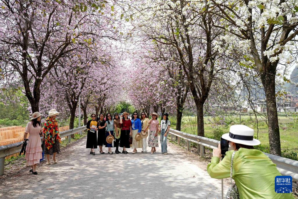 4月16日,在广西柳州市融水苗族自治县融水镇,人们在紫荆花下拍照。