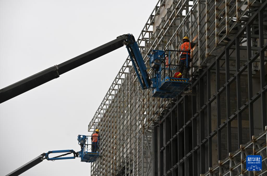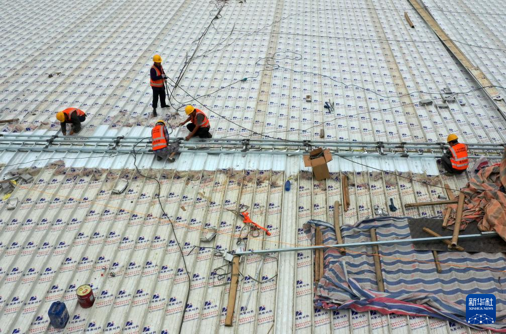 4月17日,在南凭高铁崇凭段凭祥东站,中铁四局工人在装修施工中(无人机照片)。