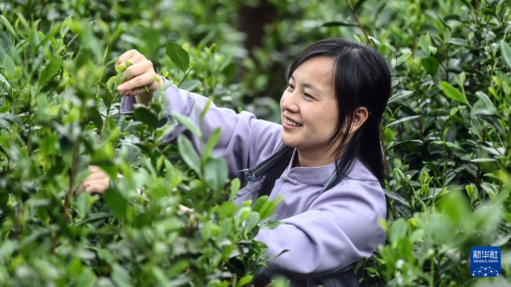 曹丽琼在三江县光辉村茶园采茶(4月24日摄)。