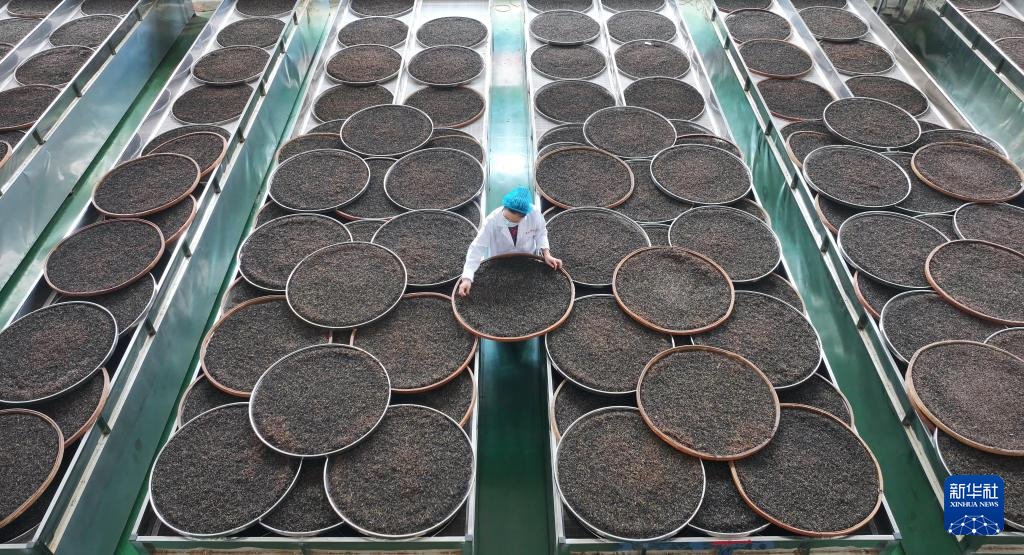 工人在曹丽琼经营的三江御香茶业有限公司制茶车间进行茶叶杀青(3月23日摄)。