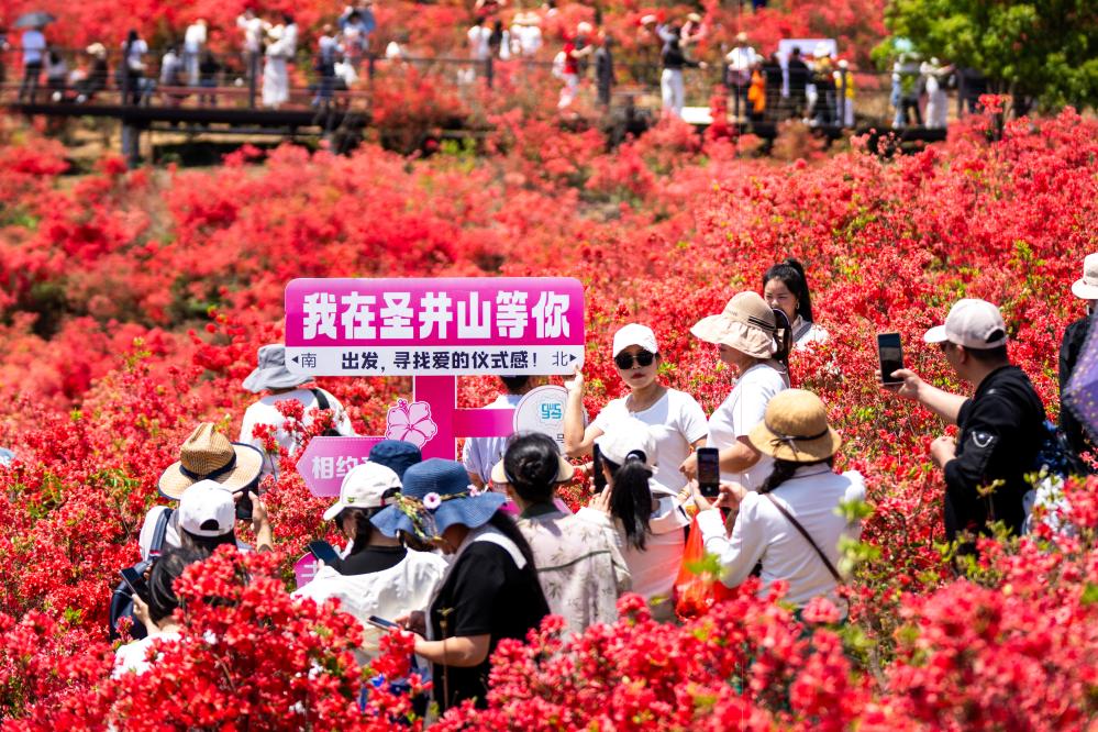 2025年4月16日,游客在浙江省瑞安市马屿镇圣井山杜鹃花海赏花。新华社发(孙凛摄)