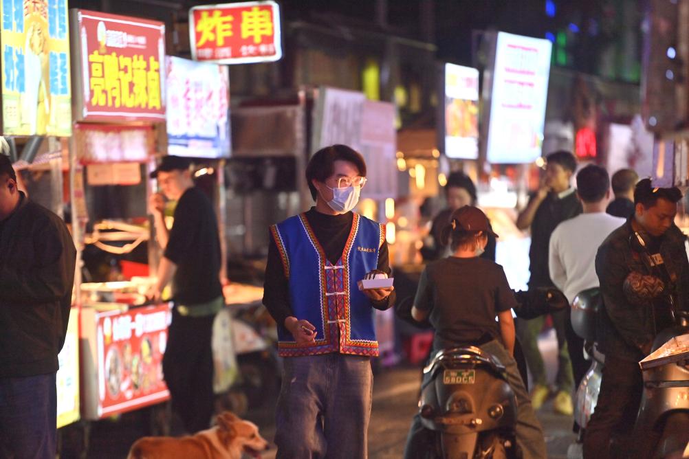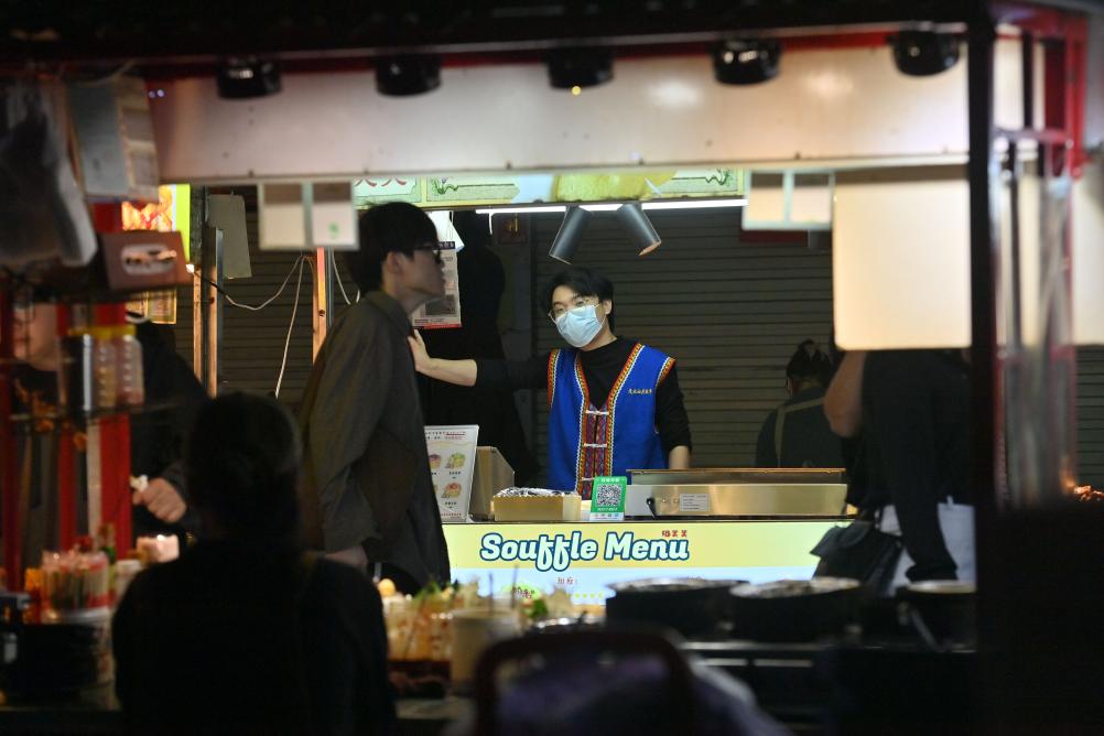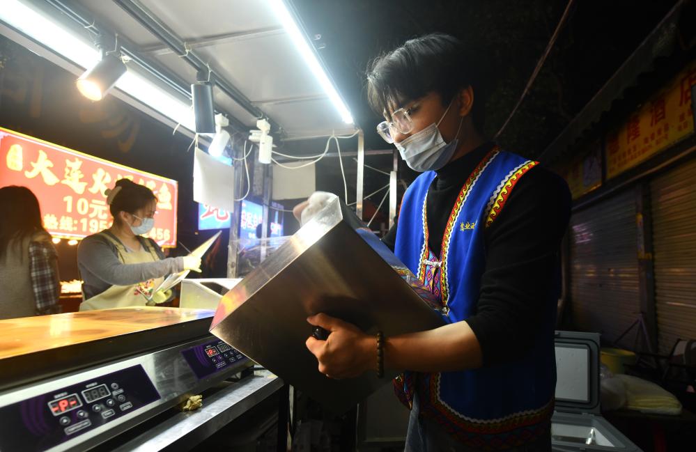 陆一鼎在南宁市西关夜市吆喝售卖蛋糕(4月6日摄)。