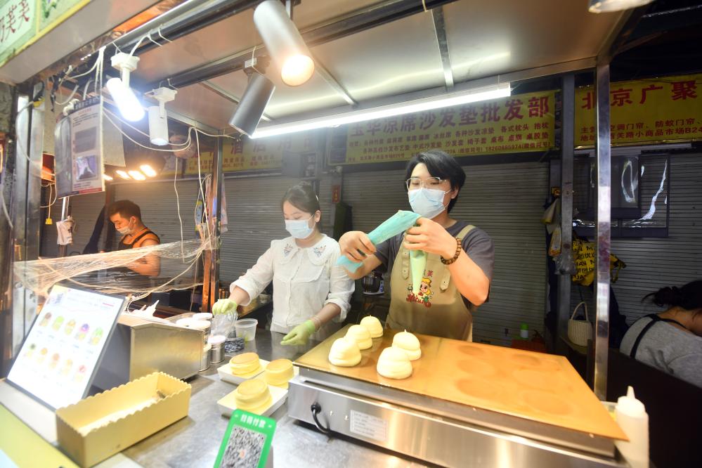 陆一鼎(右)和王芙芙在南宁市西关夜市制作蛋糕(5月20日摄)。