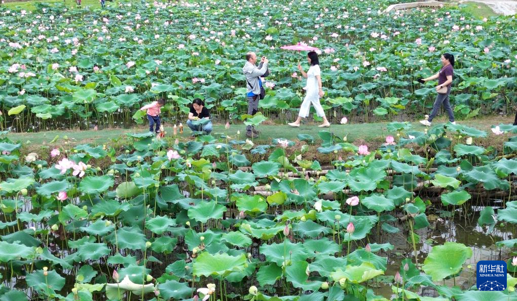 5月25日,游客在广西贺州市平桂区鹅塘镇栗木村一处乡间荷塘观赏荷花(无人机照片)。