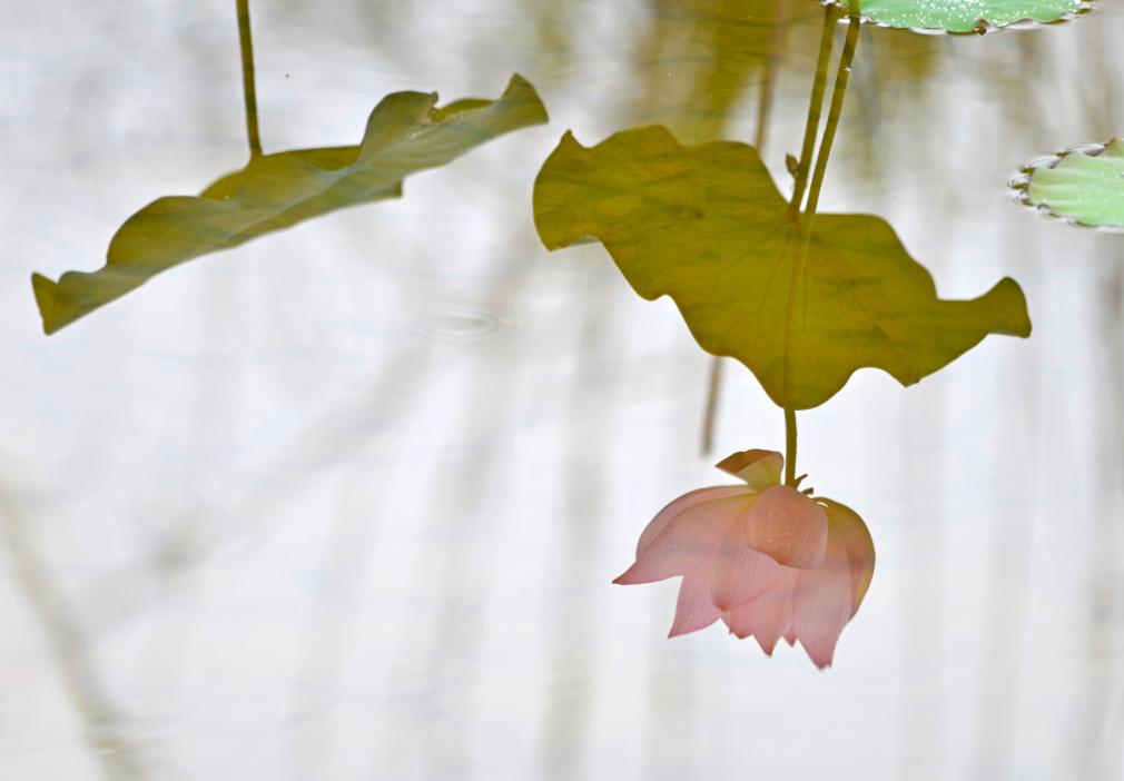 ↑2025年5月25日在广西南宁市邕宁区顶蛳山田园风光区拍摄的水中荷花倒影。CICPHOTO/滕忠 摄
