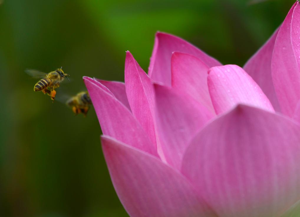 ↑2025年5月25日,广西南宁市邕宁区顶蛳山田园风光区,一只蜜蜂在荷花上飞舞。CICPHOTO/滕忠 摄