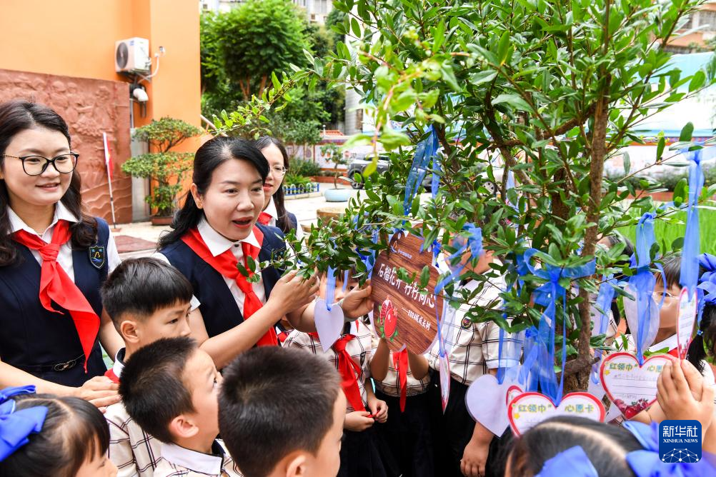 5月30日,在广西南宁市滨湖路小学教育集团滨湖校区少先队员入队仪式结束后,老师与新入队的少先队员们一起种下象征团结的石榴树,并在心愿卡上写下心愿与祝福。