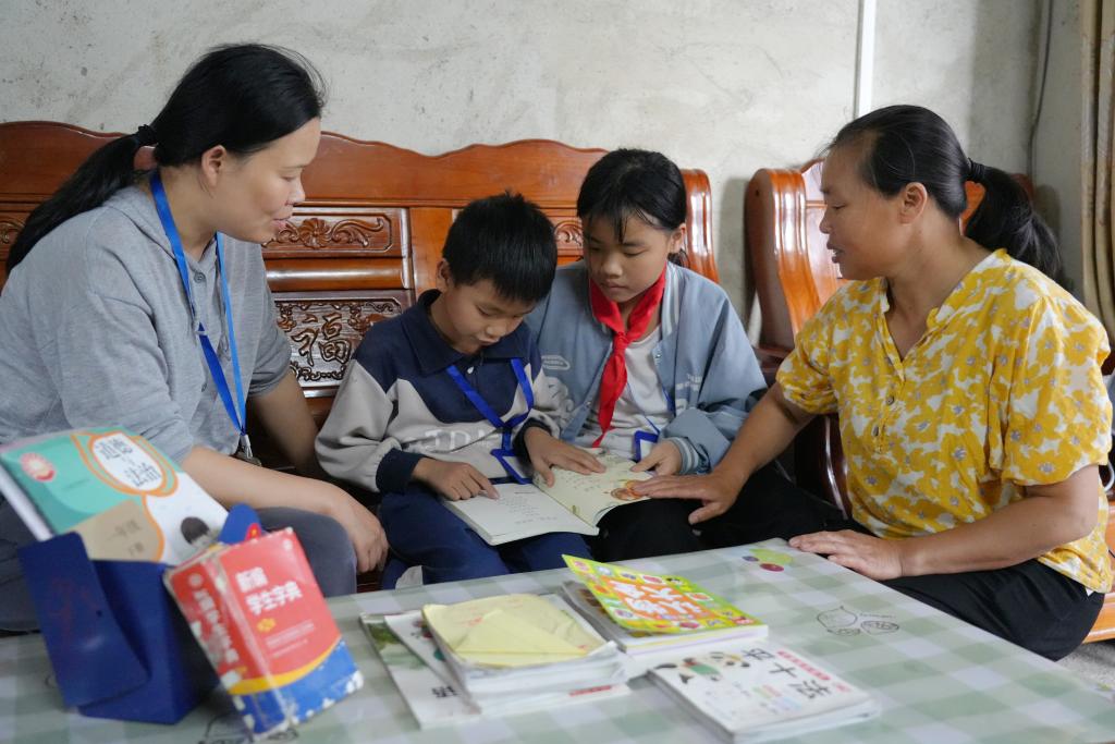 香花小学教师陈雪玲(左一)在学生苏富榆(左二)家中家访。新华社记者 张枫 摄