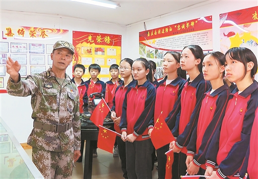 在那坡县天池国防民兵哨所,师生们认真聆听哨长凌尚前不忘初心、为国巡哨的感人事迹。 那坡县融媒体中心供图