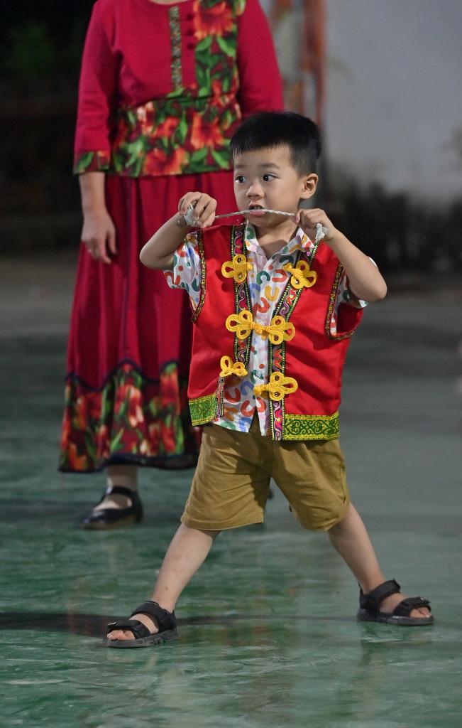 在广西河池市大化瑶族自治县大化镇仁良村,3岁的覃文君准备参加少儿陀螺比赛(2023年7月23日摄)。
