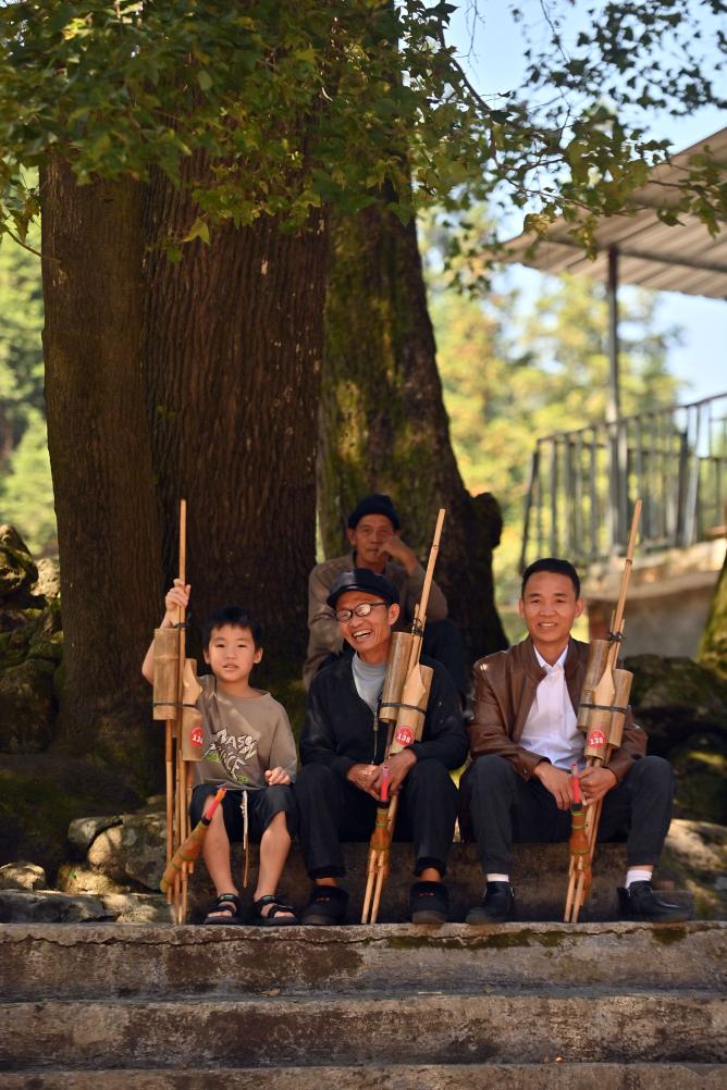 芦笙是苗族人们最爱的乐器,是苗族人们的精神寄托,是苗族文化传承的载体。在乌英苗寨,芦笙文化历史悠久。当地人说,没有不会吹芦笙的乌英人,乌英人的血液里都流淌着芦笙。乌英苗寨芦笙队队长梁秀前和我说,小时候,没有人教他吹芦笙,自己天天跟着大人吹,慢慢就会了。现在,他11岁的儿子梁文雄,也不需要他教,自己慢慢学会了吹芦笙。