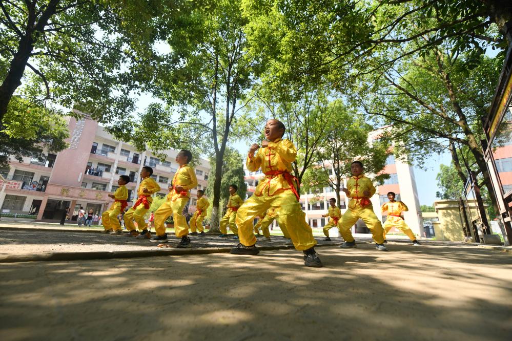 2025年5月13日,学生在蒙山县文圩镇文圩中心小学练习武术操。