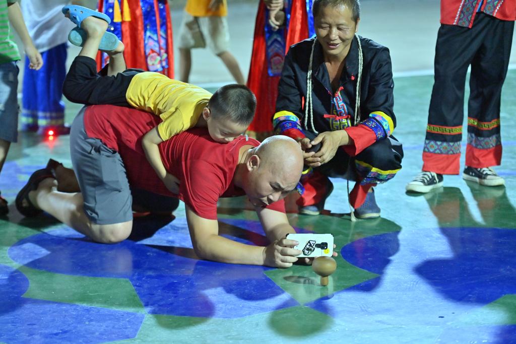在瑶山的仁良村,4岁的黄弘程,趴在爸爸的身上,感受陀螺运动的乐趣;场边,一排小学生排着队,等候上场比赛。