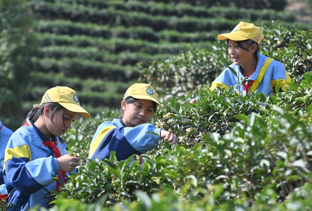 在梧州市苍梧县六堡镇塘平小学“红领巾茶园”,学生在采茶(2024年12月3日摄)。