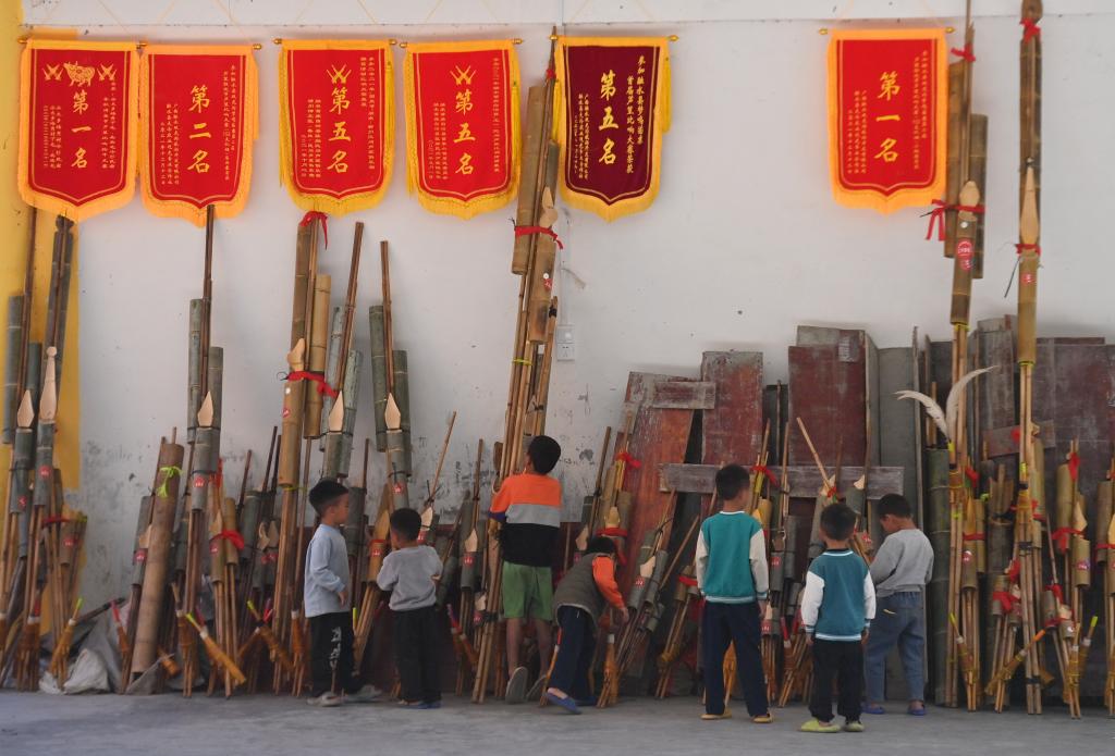 乌英苗寨教学点的孩子们在“亮布文化进校园”课堂上,练习使用亮布槌(2022年11月14日摄)。