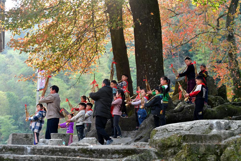 在桂黔乌英苗寨教学点“芦笙文化进校园”课堂上,师生们在古树下吹奏芦笙(2021年12月14日摄)。