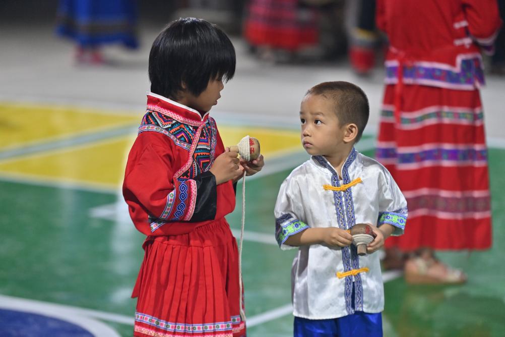 乌英苗寨的孩子们参加芦笙组装比赛(2024年8月8日摄)。